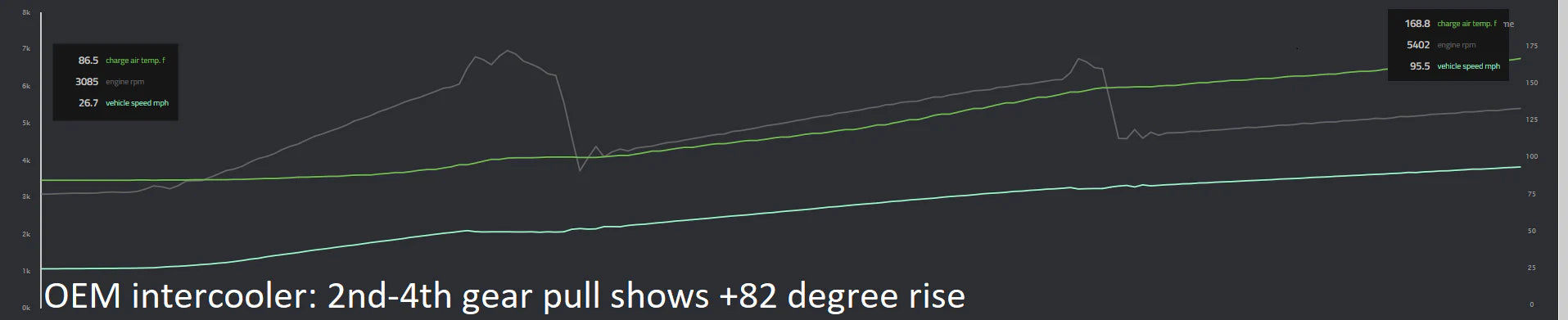 The CVF Race Intercooler for 2015-2023 Ford Mustang EcoBoost is a direct fit replacement that is over 200% larger than the stock unit, featuring a core size of 21" x 15" x 4". As the charts above indicate, during independent testing we've observed a reduction of 92 degrees in Charge Air Temperature where it matters: on the street, and not at the dyno (the same vehicle under similar conditions).