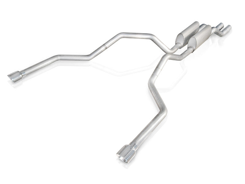 2004-08 F150 Triton 5.4L 2WD/ 4WD exhaust - made from 304 stainless steel this 2-1/2" catback features turbo chambered mufflers, clamps and hangers. Includes two 4" diameter slash-cut double-wall conical tips. Fits Stainless Works Performance Connect headers for true dual power. Exits under both sides of rear bumper. Fits Supercrew 5.5' or 6.5' bed or Supercab 6.5' bed.