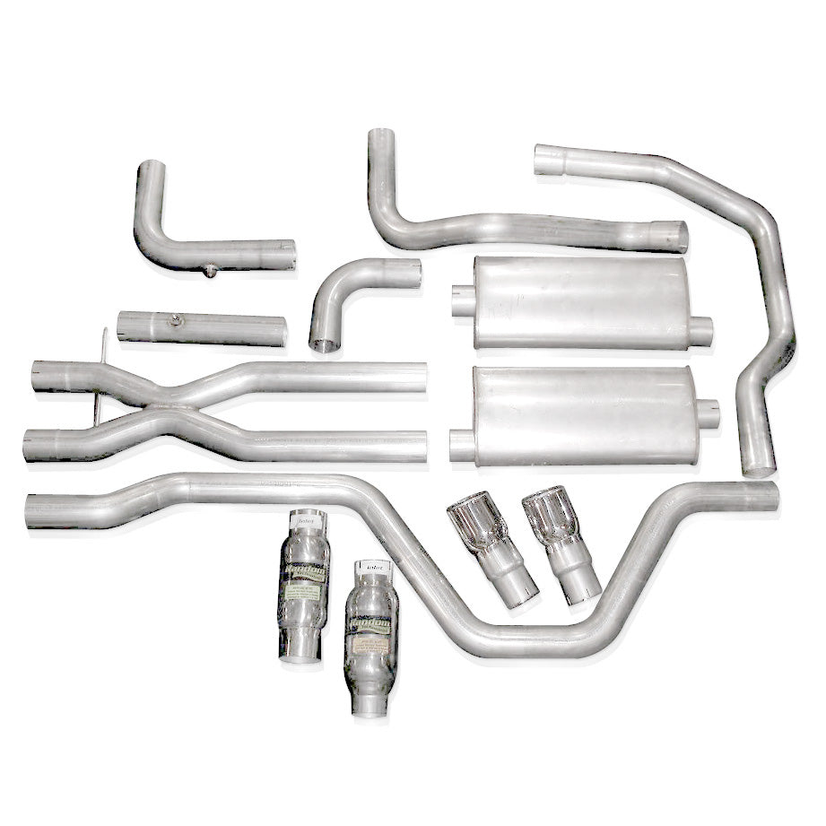 2003-06 Chevy SSR, True Dual exhaust system with dual high-flow catalytic converters. For use with Stainless Works SSR headers (SSRHDR-TD). CNC Mandrel bent 2-1/2" 304 stainless steel exhaust system with x-pipe and dual chambered turbo mufflers. Bolts to Stainless Works headers and exits under the rear valence openings with dual rolled edge 4" polished, slash cut tips. Also comes with all hangers and clamps needed for assembly. These kits come with a lifetime warranty and proudly made in the USA.